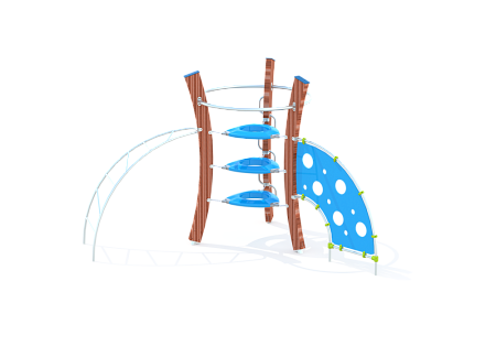 Универсальный комплекс состоит из гимнастического оборудования и трех изогнутых стоек с подвесными пластиковыми лазами, установленных между ними. Все металлические гимнастические элементы выполнены из нержавеющей стали. Деревянные стойки выполнены из тщательно отшлифованной древесины высочайшей прочности и окрашены высококачественным лаковым покрытием. Стенка выполнена из HPL пластика. Лазы с отверстиями выполнены из высококачественного пластика.