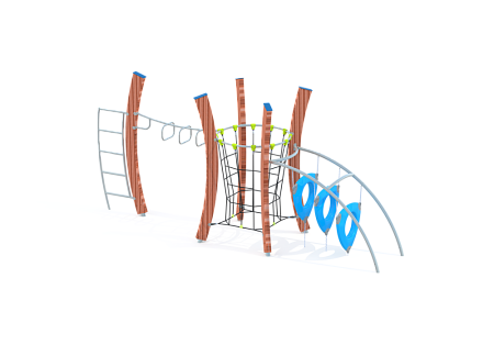 Универсальный комплекс состоит из гимнастического оборудования и пяти изогнутых деревянных стоек. Между четырьмя стойками крепится круглая вертикальная сетка-лаз. Все металлические гимнастические элементы выполнены из стали с оцинкованным покрытием. Оцинковка металла производится методом электрохимической гальванизации. Деревянные стойки выполнены из тщательно отшлифованной древесины высочайшей прочности и окрашены высококачественным лаковым покрытием. Лазы с отверстиями выполнены из высококачественного пластика. Сетки изготовлены из многожильного армированного износостойкого каната.