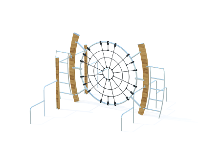 Универсальный комплекс состоит из гимнастического оборудования и двух изогнутых деревянных стоек. Между деревянных стоек крепится вертикальная круглая сетка на металлокаркасе. Все металлические гимнастические элементы выполнены из из нержавеющей стали. Деревянные стойки выполнены из тщательно отшлифованной древесины высочайшей прочности и окрашены высококачественным лаковым покрытием. Сетки изготовлены из многожильного армированного износостойкого каната.