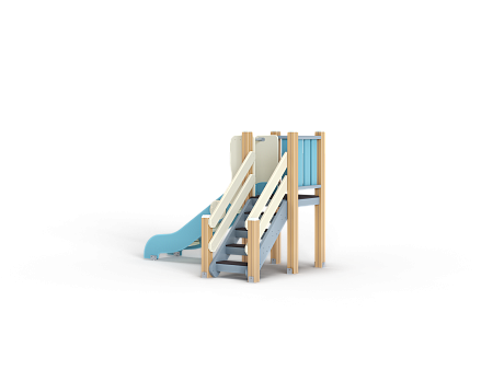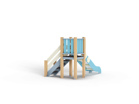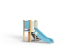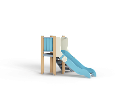 Комплекс состоит из башни с горкой с высотой ската 900 мм, лестницы и двух ограждений из бруса.