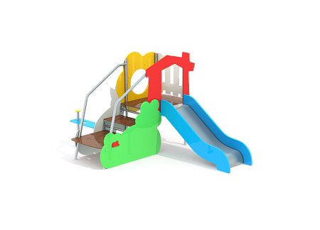 Домик Солнышко состоит из каркаса с площадкой, горкой, лестницей и ограждениями выполненными в форме различных фигур. Одно ограждение имеет круглый вырез, к которому крепится иллюминатор и высококачественного прозрачного пластика. Каркас домика выполнен из стали с оцинкованным покрытием. Оцинковка металла производится методом электрохимической гальванизации. Огаждения, ступени и площадка выполнены из HPL пластика. Скат горки выполнен из нержавеющей стали.