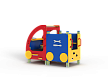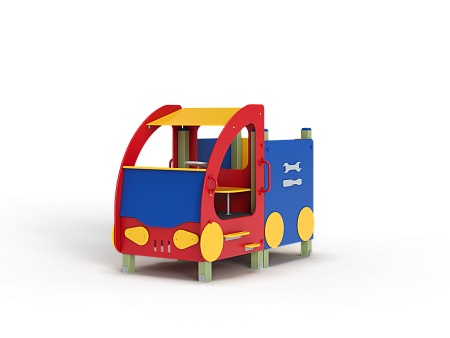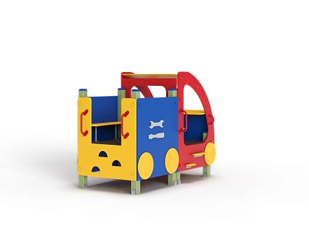 Машина выполнена из фанерных элементов в виде кабины и кузова. Кабина имеет вход с двух сторон, по две ступеньки и по две ручки с каждой стороны, вращающийся руль и сидение. Кузов - открытая площадка со входом в виде альпинистской стенки. На бортах кузова прикреплены декоративные элементы в виде слесарных инструментов.