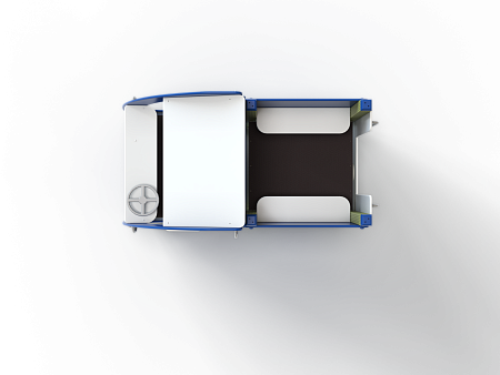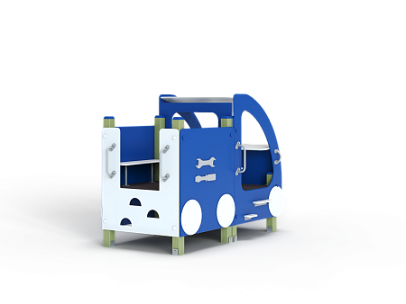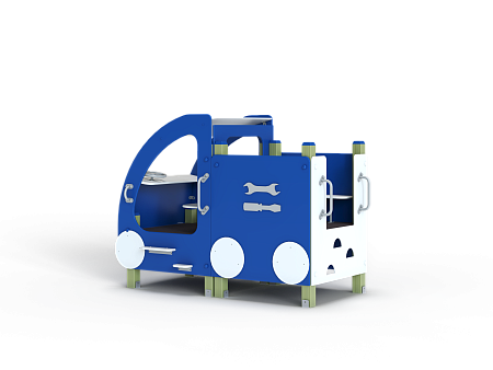 Машина выполнена из фанерных элементов в виде кабины и кузова. Кабина имеет вход с двух сторон, по две ступеньки и по две ручки с каждой стороны, вращающийся руль и сидение. Кузов - открытая площадка со входом в виде альпинистской стенки. На бортах кузова прикреплены декоративные элементы в виде слесарных инструментов.