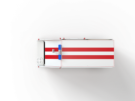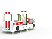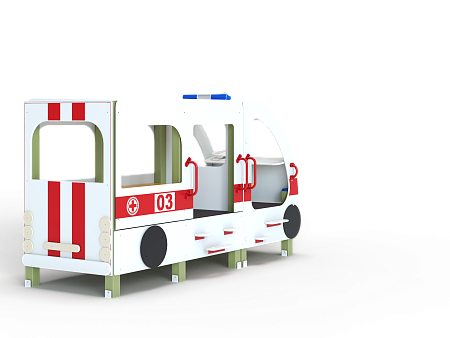 Автобус состоит из двух площадок в виде кабины и кузова с бортовыми фанерными ограждениями иммитирующих детали автобуса в цветовой гамме службы скорой помощи с художественным оформлением. Кабина имеет вход с двух сторон, по две ступеньки и по две ручки с каждой стороны, вращающийся руль и сидение. Кузов - площадка, имеющая один вход и скамейки внутри. У входа в кузов установлены три ступеньки и две ручки..