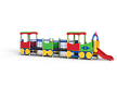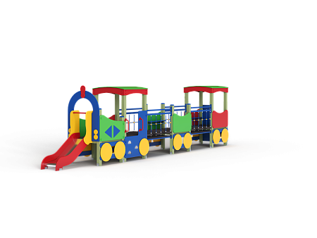 Паровозик состоит из кабины с крышей, котла с горкой и двух вагончиков. Кабина имеет вход в виде альпинистской стенки и две вспомогательные ручки, фанерное ограждение и крыша. Котел - открытая площадка с горкой, декоративной аркой и фанерным ограждением с художественным оформлением. Первый вагончик имеет два фанерных ограждения, второй вагончик имеет два фанерных ограждения, крышу, скамейку, вход в виде альпинистской стенки и две ручки. Вагончики соединены между собой и кабиной подвесными качающимися мостами. Снизу по бокам расположены декоративные колеса.