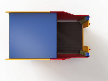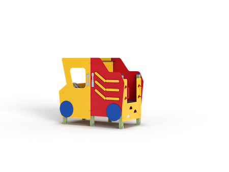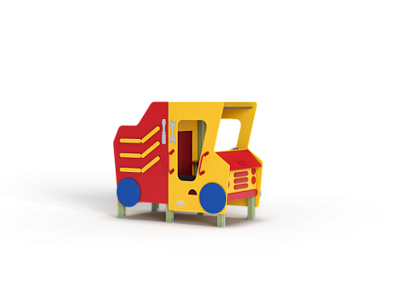 Самосвал состоит из крыши, ограждений в виде деталей кузова самосвала, лавочки, руля, ручек и декоративных фанерных элементов.