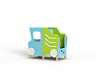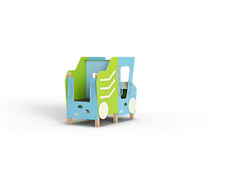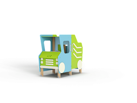 Самосвал состоит из крыши, ограждений в виде деталей кузова самосвала, лавочки, руля, ручек и декоративных фанерных элементов.