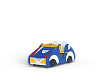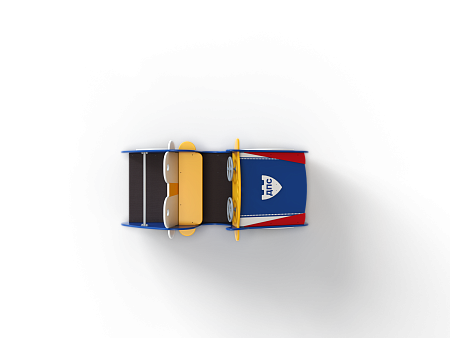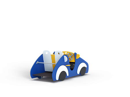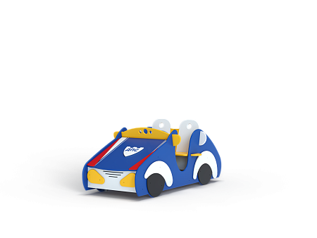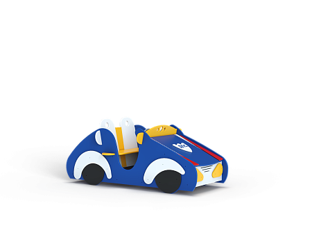 Машинка выполнена из фанерных деталей с раскраской в цветах службы ДПС, металлокаркаса, декоративных фанерных элементов и двух рулей.