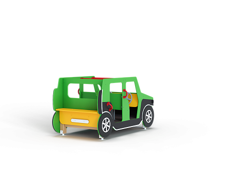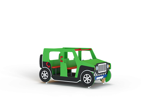Вездеход состоит из площадки с фанерными элементами в виде кузовных деталей, ручек, вращающегося руля, металлических перекладин и сидений со спинками. За задней стенкой вездехода крепится фанерное сидение.