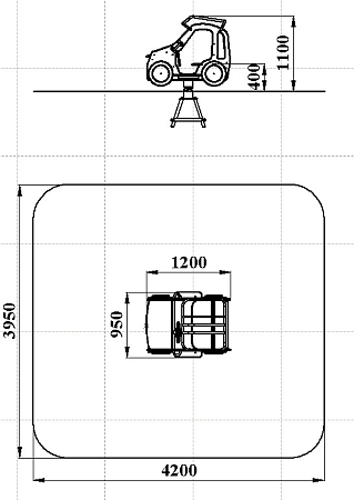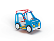 Качалка на пружине в форме джипа изготовлена из фанерных элементов с художественным оформлением в стиле службы ДПС, металлического защитного каркаса, вращающегося руля и металлических элементов с пружиной.