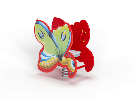 Качалка на пружине в форме бабочки изготовлена из фанерных элементов с ручной художественной росписью и металлических элементов с пружиной.