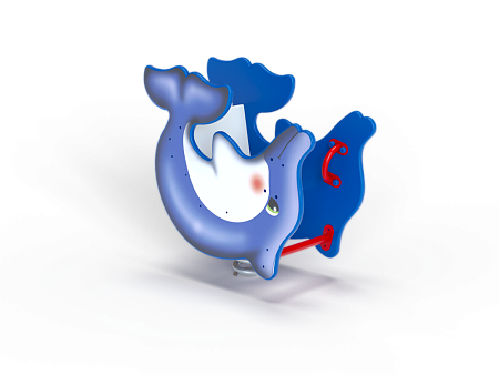 Качалка на пружине в форме дельфина изготовлена из фанерных элементов с ручной художественной росписью и металлических элементов с пружиной.
