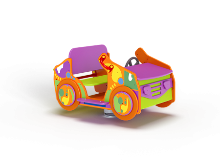 Качалка на пружине в форме машинки изготовлена из фанерных элементов с ручной художественной росписью в стиле граффити, вращающегося руля и металлических элементов с пружиной.