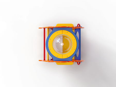Качалка на пружине в форме батисферы изготовлена из фанерных элементов с ручной художественной росписью и металлических элементов с пружиной.