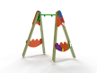 Качели состоят из четырех деревянных столбов, крепежных фанерных накладок с художественным оформлением в стиле граффити и перекладины под один подвес.