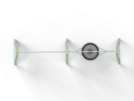 Качели состоят из четырех деревянных столбов, крепежных фанерных накладок и перекладины с прорезиненым подвесом из полипропиленового каната, сплетенного в виде гнезда.