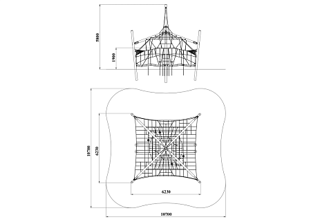 Комплекс выполнен в виде комбинации гимнастических элементов выполненных из столбов, бревен и сеток, в совокупности образующих купол с сеточным обвесом.