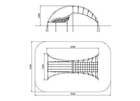 Металические элементы каркаса комплекса выполнены из стали с оцинкованным покрытием, с антивандальными и безопасными соединениями между собой. Оцинковка металла производится методом электрохимической гальванизации. Сетки и канаты изготовлены из многожильного армированного износостойкого каната. Стенки выполнены из экструдированного высокомолекулярного полиэтилена.