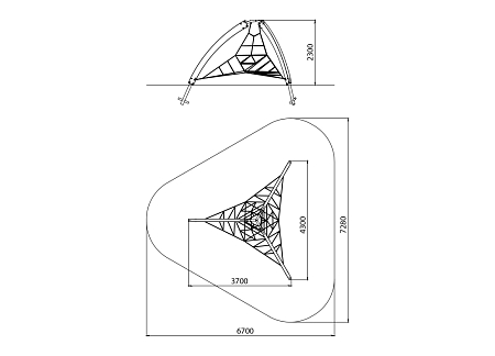Универсальный комплекс состоит из трех изогнутых деревянных стоек с треугольной трехмерной сеткой, растянутой между ними. Все металлические элементы выполнены из стали с оцинкованным покрытием. Оцинковка металла производится методом электрохимической гальванизации. Деревянные стойки выполнены из тщательно отшлифованной древесины высочайшей прочности и окрашены высококачественным лаковым покрытием. Сетки изготовлены из многожильного армированного износостойкого каната.