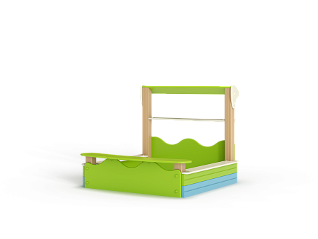 Песочница выполнена из бруса, фанерных стенок с художественным оформлением, опорных столбов, фанерных накладок-сидений и фанерного спойлера.