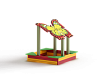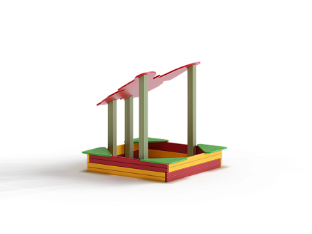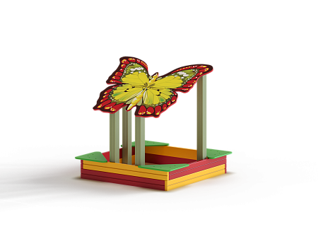 Песочница выполнена из бруса и угловых фанерных накладок, скрепленных между собой при помощи металлических закладных стоек. Внутри песочницы установлен фанерный навес в форме бабочки с художественным оформлением.