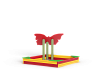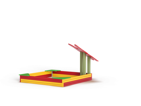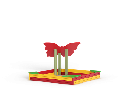 Песочница выполнена из бруса и угловых фанерных накладок, скрепленных между собой при помощи металлических закладных стоек. В углу песочницы, внутри, установлен фанерный навес в форме бабочки с художественным оформлением.