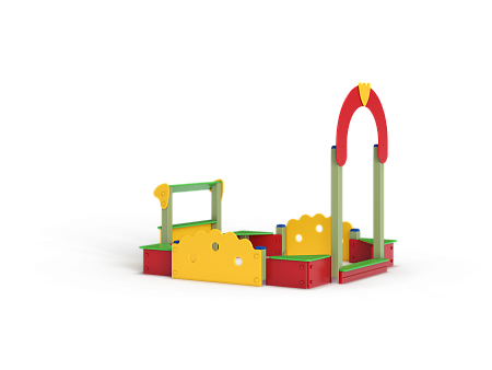 Песочница состоит из столбов с прикрепленными к ним по периметру фанерными ограждениями. Вход в песочницу выполнен в виде декоративной фанерной арки. На столбах напротив входа установлен спойлер.