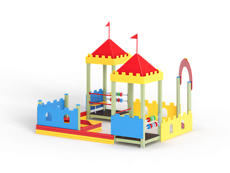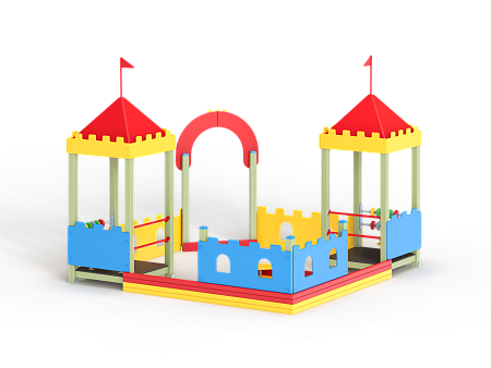 Песочный дворик – модульная конструкция из игровых и развивающих элементов с кремлевской тематикой. Конструкция оборудована двумя башнями беседками, одной аркой, песочницей, ограждением по периметру из деревянного бруса и фанеры. Башни беседки оборудованы крышами, металлическими перекладинами, фанерными ограждениями, детскими счетами с пластиковыми бубликами и сидениями. Песочница с четырьмя фанерными накладками и декоративным фанерным ограждением в наружном углу в форме стен кремля.