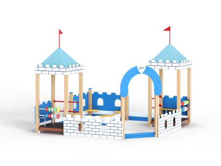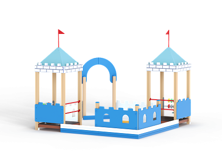 Песочный дворик – модульная конструкция из игровых и развивающих элементов с кремлевской тематикой и окраской в цветах службы ДПС. Конструкция оборудована двумя башнями беседками, одной аркой, песочницей, ограждением по периметру из деревянного бруса и фанеры с художественным оформлением. Башни беседки оборудованы крышами, металлическими перекладинами, фанерным ограждением, детскими счетами с пластиковыми бубликами и сидением. Песочница с четырьмя фанерными накладками и декоративным фанерным ограждением в наружном углу в форме стен кремля.