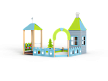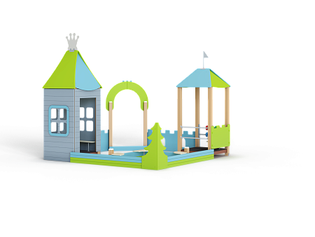 Песочный дворик Белоснежка - модульная конструкция из игровых и развивающих элементов с тематикой сказки «Белоснежка. Конструкция оборудована двумя башнями - беседками, одной аркой, песочницей и ограждением по периметру из деревянного бруса и фанеры с декоративными накладками с художественным оформлением. Башни оборудованы крышей, фанерным ограждением, металлическими перекладинами и детскими счетами с пластиковыми бубликами. Арка выполнена из фанеры с декоративными фанерными элементами в форме гномиков с художественным оформлением. Песочница с четырьмя фанерными накладками и декоративным фанерным ограждением в наружном углу в форме ёлки.
