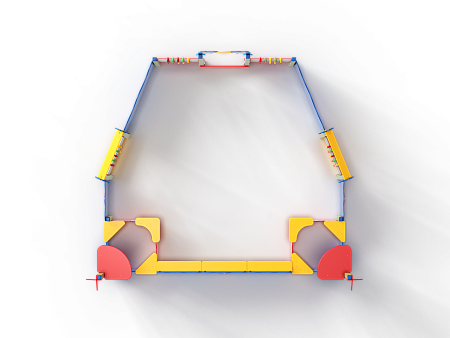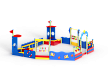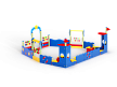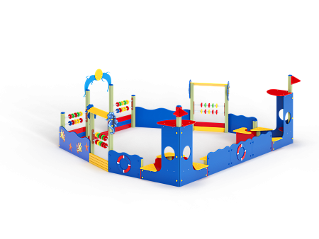 Песочный дворик – модульная конструкция из игровых и развивающих элементов с морской тематикой. Конструкция оборудована двумя песочницами, одной аркой и ограждением из бруса и фанеры по периметру. Песочницы оборудованы навесами, декоративными фанерными флажками, ограждениями, два из которых имеют круглый вырез в виде иллюминатора и фанерные накладки. По периметру дворика расположены детские счеты с пластиковыми бубликами, сидения, арка в виде дельфинов с декоративным соединяющим элементом из фанеры в виде мяча, спойлеры с накладками в виде морских коньков с художественным оформлением.