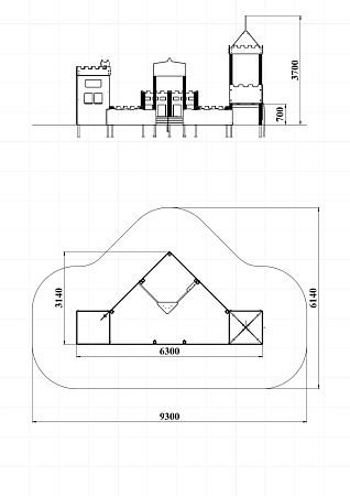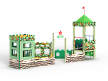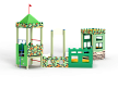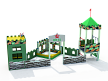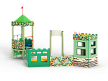 Песочный дворик – модульная конструкция из игровых и развивающих элементов с художественным оформлением в военной тематике. Состоит из башни-вышки, домика-штаба и песочницы. На башне-вышке установлена крыша, фанерные ограждения, альпинистская стенка, перекладины, перекладина с канатом и ручки вспомогательные. Домик-штаб состоит из башни с фанерными стенами и окнами. Крыша домика имеет декоративный элемент в виде антенны. Внутри домика расположена скамейки на металлических ножках и стол. Периметр песочницы огорожен деревянным брусом и фанерным ограждением, доступ в периметр осуществлен в виде арочного входа.