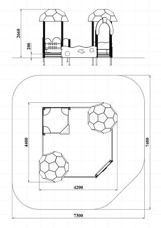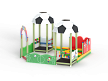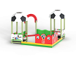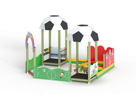 Песочный дворик – модульная конструкция из игровых и развивающих элементов с футбольной тематикой. Конструкция оборудована двумя башнями беседками, одной аркой, песочницей, ограждением по периметру из деревянного бруса и фанеры с художественным оформлением. Башни беседки оборудованы крышами в виде половинок футбольного мяча, металлическими перекладинами, фанерным ограждением, детскими счетами с пластиковыми бубликами и сидением. Песочница с четырьмя фанерными накладками и декоративным фанерным ограждением в наружном углу.