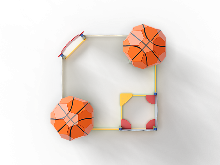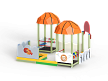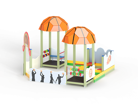 Песочный дворик – модульная конструкция из игровых и развивающих элементов с художественным оформлением в баскетбольной тематике. Конструкция оборудована двумя башнями беседками, одной аркой, песочницей, ограждением по периметру из деревянного бруса и фанеры с художественным оформлением. Башни беседки оборудованы крышами в виде половинок баскетбольного мяча, металлическими перекладинами, фанерным ограждением, детскими счетами с пластиковыми бубликами и сидением. Песочница с четырьмя фанерными накладками и декоративным фанерным ограждением в наружном углу.