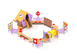 По перимитру восьмигранной песочницы расположены - борта песочницы, крытый домик с горкой и лестницей, четыре площадки с ограждениями с различными игровыми элементами , доска для рисования, табуреты, туннельный лаз из высокопрочного пластика и металлические стойки. Ограждения и накладки изготовлены из HPL пластика. Металлические элементы выполнены из нержавеющей стали.
