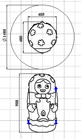 Матрешка высотой 900 мм представляет собой конструкцию, основой которой является бетонная модель, по всей площади покрытая слоем цветной искусственной каучуковой TPV крошки, образуя форму и расцветку матрешки
