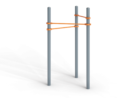 Воркаут состоит из трех несущих столбов и трех перекладин с зажимными хомутами.