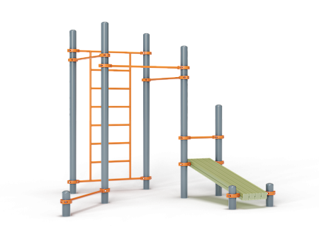 Воркаут состоит из восьми несущих столбов, семи перекладин, шведской стенки и наклонной скамьи из бруса с зажимными хомутами.