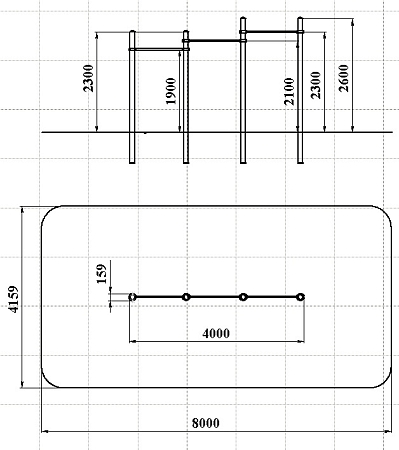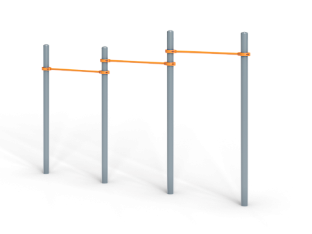 Воркаут состоит из четырех несущих столбов и трёх перекладин с зажимными хомутами.