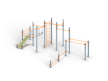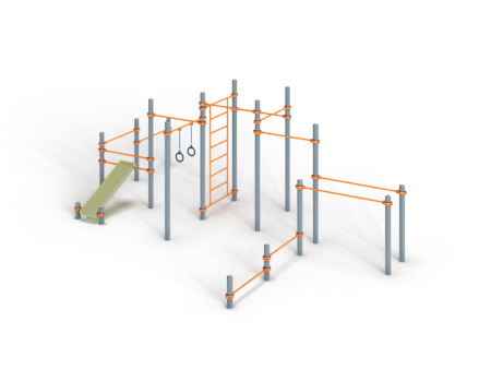 Воркаут состоит из семнадцати несущих столбов, четырнадцати перекладин, перекладины с гимнастическими кольцами, шведской стенки и наклонной скамьи из бруса с зажимными хомутами.