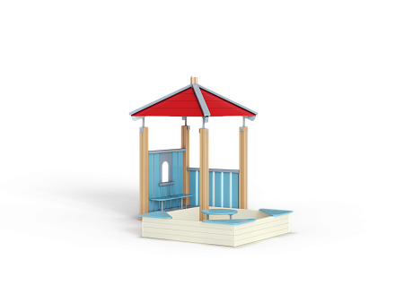 Домик состоит из башни с четырёхскатной крышей, двух ограждений из бруса и песочницы из бруса с трёмя фанерными угловыми накладками.