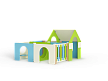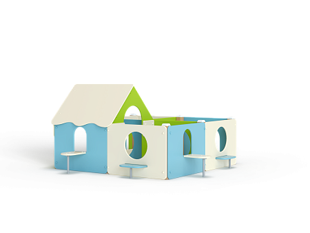 Лабиринт состоит из четырех секций (одна из них с крышей) разделенных фанерными ограждениями с круглыми и арочными лазама. Со стороны улицы крепятся столики и ступеньки.