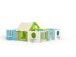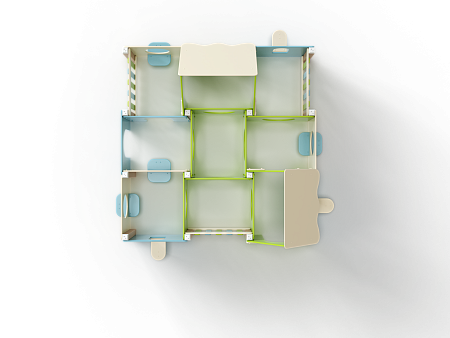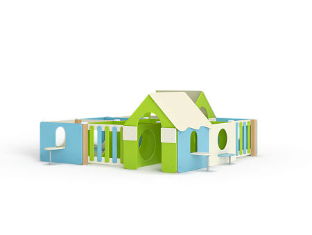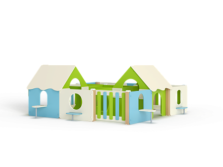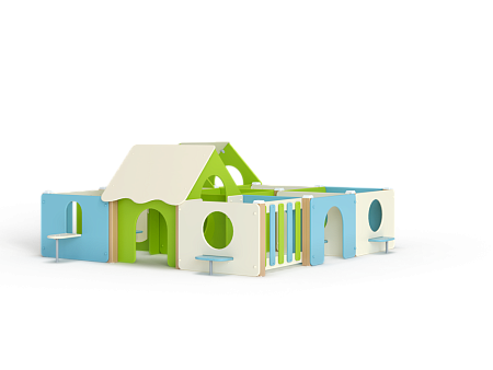 Лабиринт состоит из девяти секций (две из них с крышами) разделенных фанерными ограждениями с круглыми и арочными лазама. Со стороны улицы крепятся столики и ступеньки.