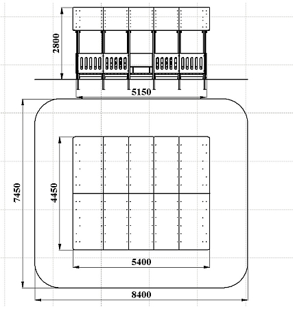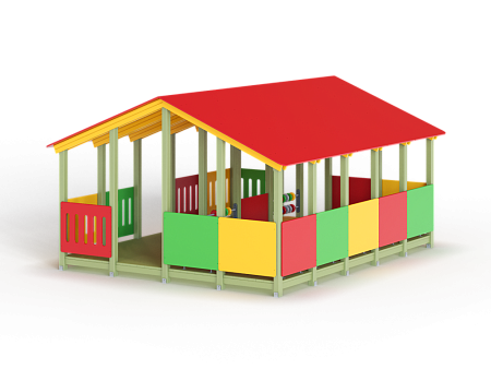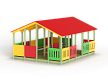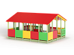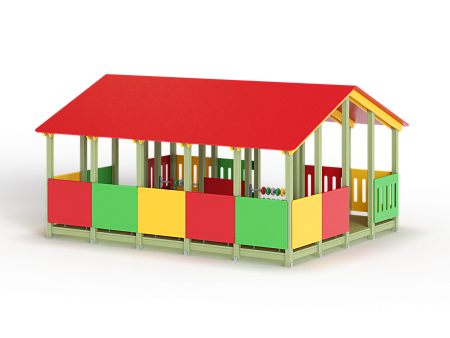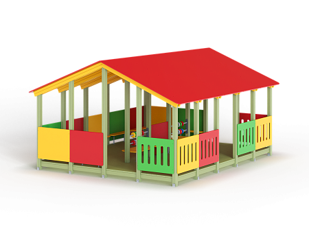 Беседка состоит из площадки с крышей, скамеек по периметру и в центре, двух комплектов детских счет, ограждений фанерных сплошных и с вырезами.