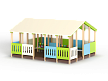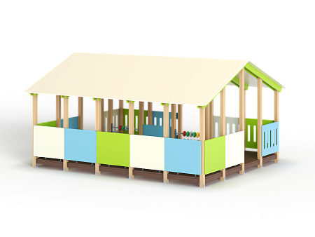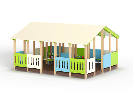 Беседка состоит из площадки с крышей, скамеек по периметру и в центре, двух комплектов детских счет, ограждений фанерных сплошных и с вырезами.