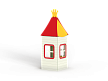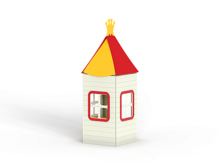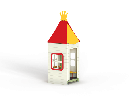 Домик состоит из башни с крышей, фанерных стен с окнами, скамейки и столика.