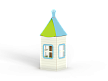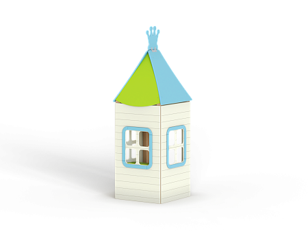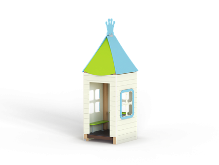 Домик состоит из башни с крышей, фанерных стен с окнами, скамейки и столика.