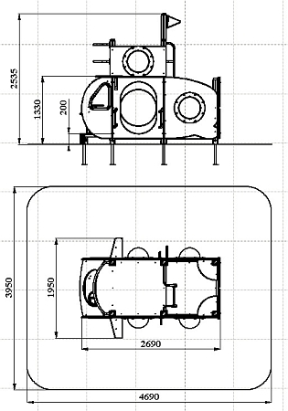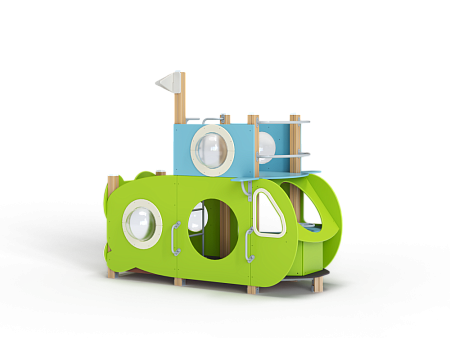 Домик скомпонован в форме подводной лодки, состоит из двух спаренных башен и одной радиусной полубашни, являющейся передом подводной лодки. Центральная башня - двухъярусная, имитирует рубку подводной лодки. Ограждениями первого яруса являются фанерные листы с вырезами-лазами. На задней части первого яруса два ограждения с пластиковыми иллюминаторами. Переход с первого яруса на второй обеспечен лестницей металлической, крепящейся снизу к полу первого яруса, сверху крепится к столбам башни. Второй ярус огражден фанерными ограждениями с пластиковыми иллюминаторами и дуговыми металлическими перекладинами.