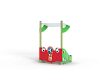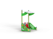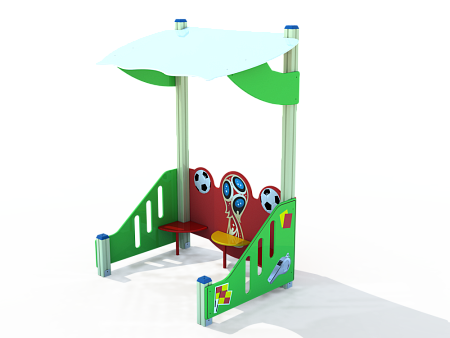 Беседка с художественным оформлением в футбольной тематике..Беседка состоит из двух ограждений, стенки с тремя скамейками и крыши.