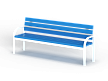 Лавочка со спинкой изготовлена из металлического каркаса белого цвета с подлокотниками и деревянного бруса голубого цвета.